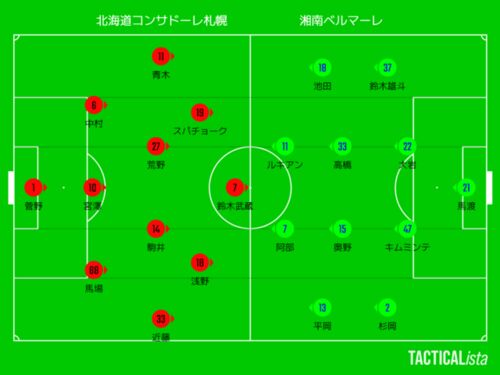 <両軍スタメン> 湘南は、田中聡がU-23代表に参加のため離脱中。 札幌は言わずと知れた「オールコートマンツーマン」なため、守備時は荒野・スパチョークがそれぞれ一列下がっての4-4-2となり相手へのマークを合わせる。